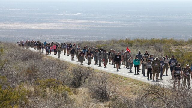 Participants can choose between a full marathon length (26.2 miles) or a shorter honorary course through tough, hilly desert terrain, with some participants carrying a 35-pound rucksack to make the event more challenging.